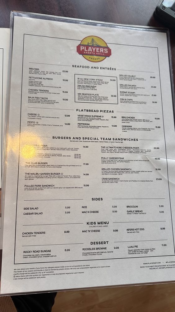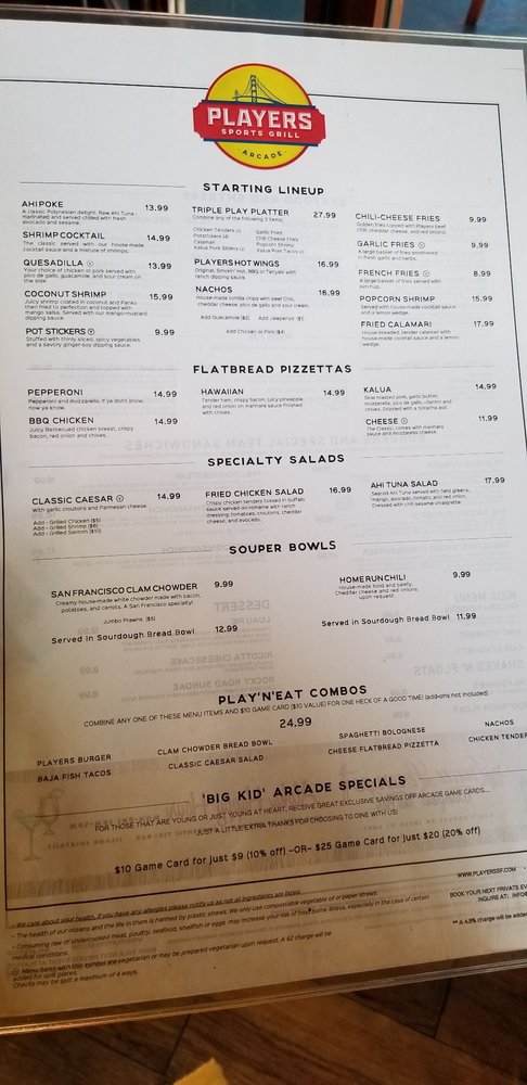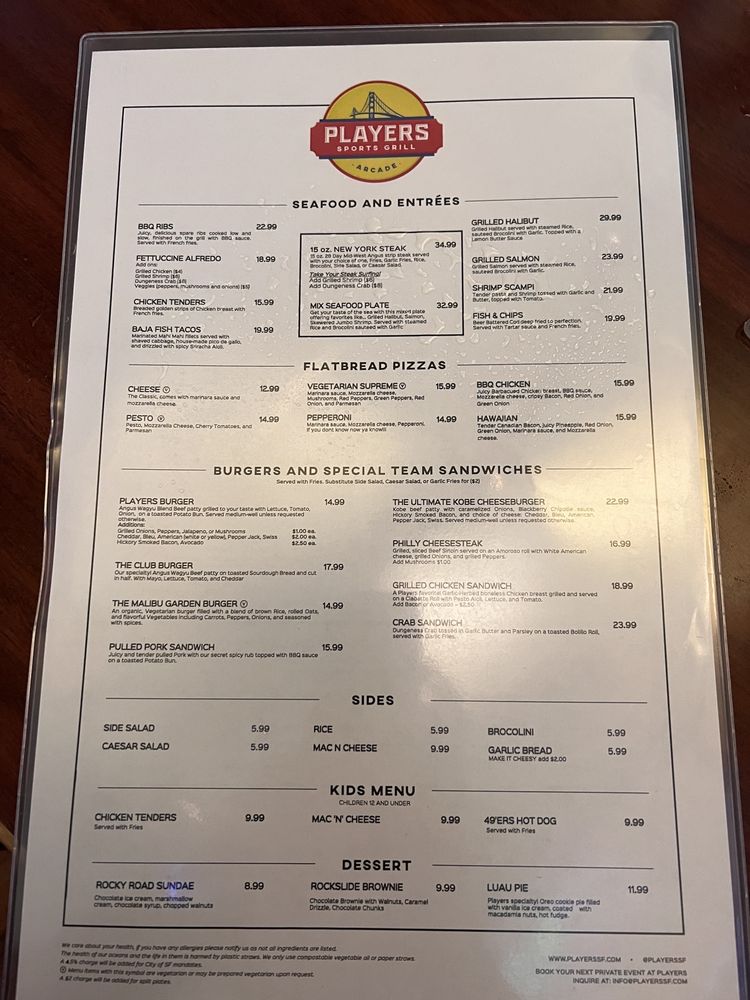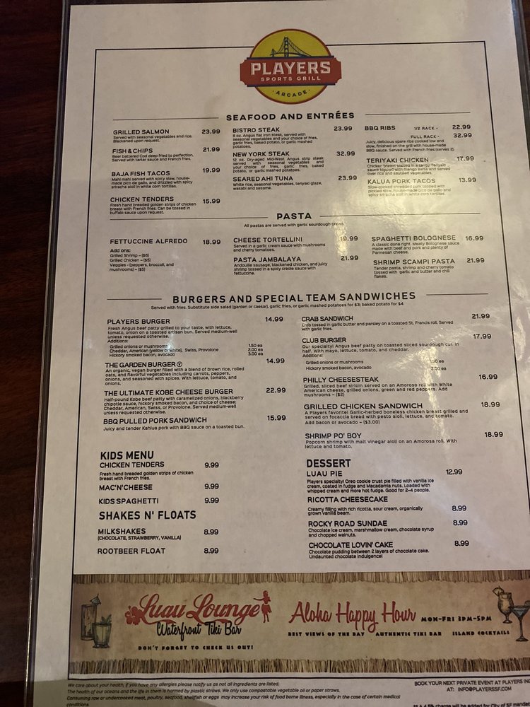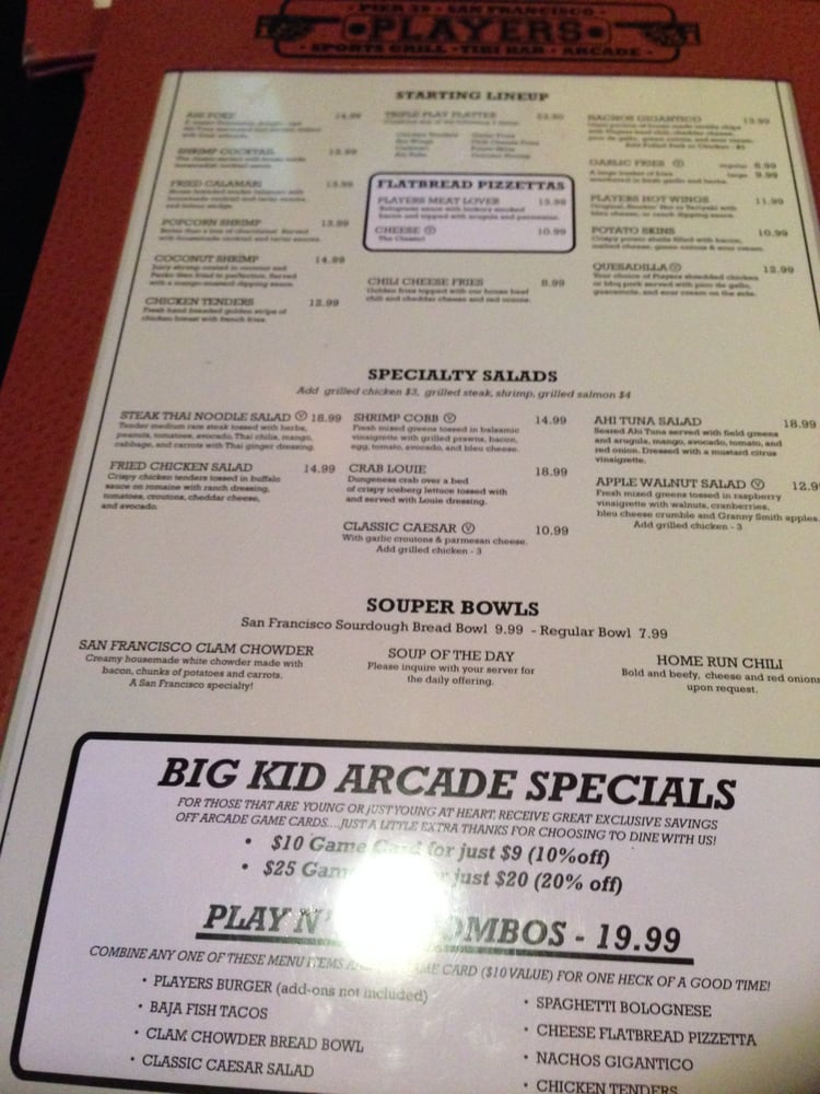 Players Sports Grill & Arcade offers a diverse menu with options for all preferences - from Ahi Poke to Steak Thai Noodle Salad, catering to vegetarians as well. The location at The Embarcadero Bldg L & M in San Francisco provides a casual, touristy atmosphere with outdoor seating and a full bar. Customers have praised the delicious food, with highlights like the Fried Calamari and the Pesto Flatbread with Pepperoni. The arcade section adds a fun and interactive element to the dining experience, making it a great spot for families and groups. Despite some mixed reviews on service speed, the overall consensus is positive, recommending Players for its fantastic views, tasty drinks, and enjoyable meals. Visit Players Sports Grill & Arcade for a memorable dining and gaming experience.