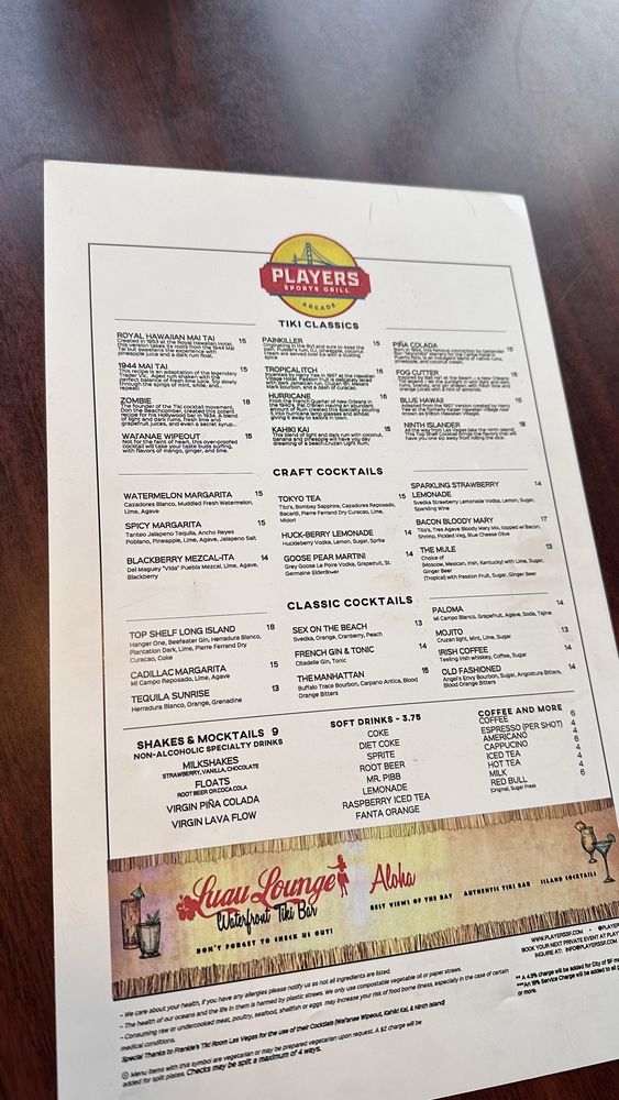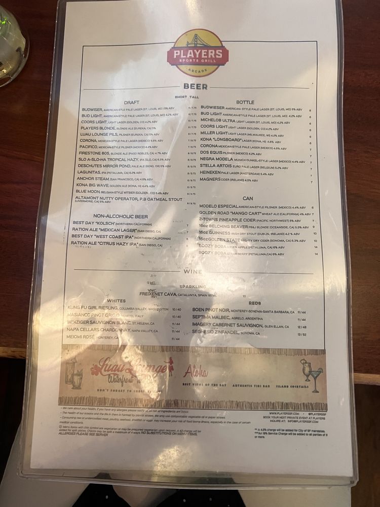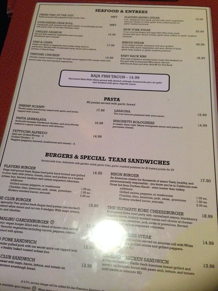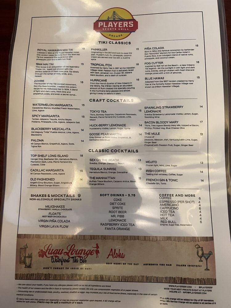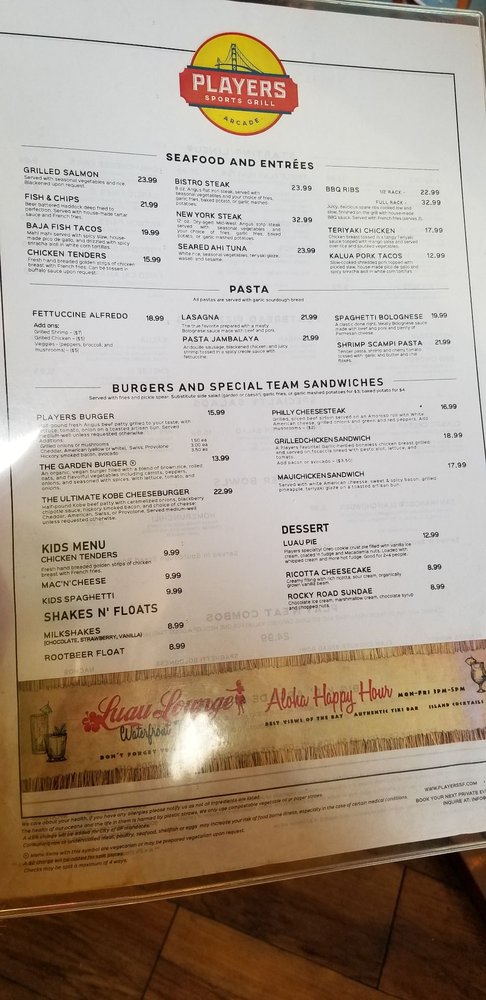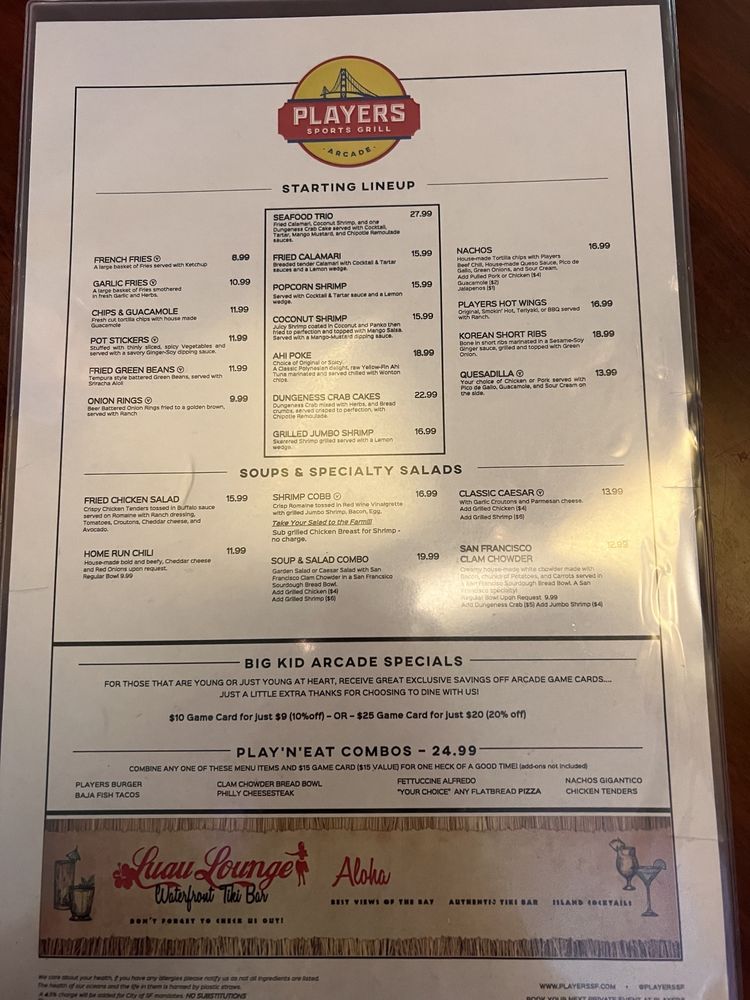 Players Sports Grill & Arcade offers a diverse menu with options for all preferences - from Ahi Poke to Steak Thai Noodle Salad, catering to vegetarians as well. The location at The Embarcadero Bldg L & M in San Francisco provides a casual, touristy atmosphere with outdoor seating and a full bar. Customers have praised the delicious food, with highlights like the Fried Calamari and the Pesto Flatbread with Pepperoni. The arcade section adds a fun and interactive element to the dining experience, making it a great spot for families and groups. Despite some mixed reviews on service speed, the overall consensus is positive, recommending Players for its fantastic views, tasty drinks, and enjoyable meals. Visit Players Sports Grill & Arcade for a memorable dining and gaming experience.